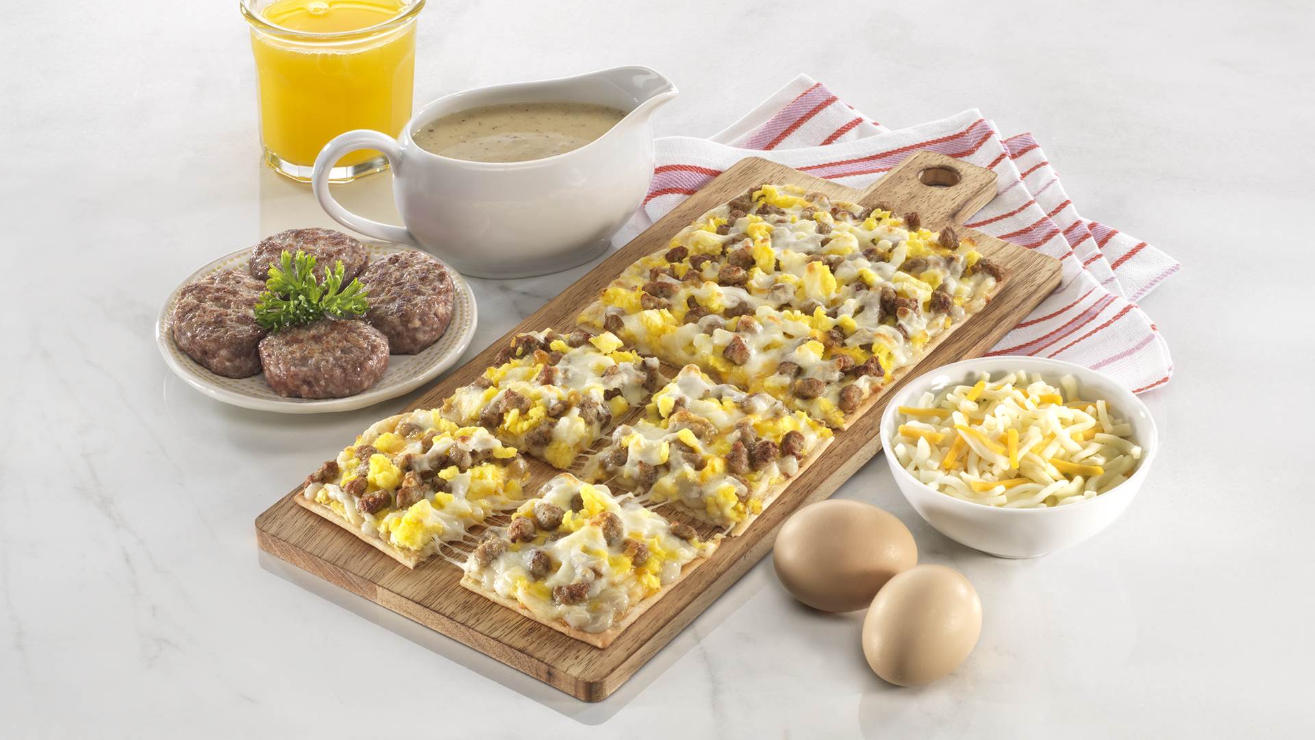 Pizza for breakfast just went from “oh no” to “oh yeah”! Enjoy light sweet breakfast sausage scrambled up with eggs, mozzarella three-cheese blend, and homemade gravy, all atop our handmade flatbread. (13 oz.; 5.5" x 11.75" flatbread)